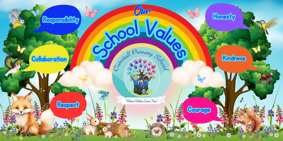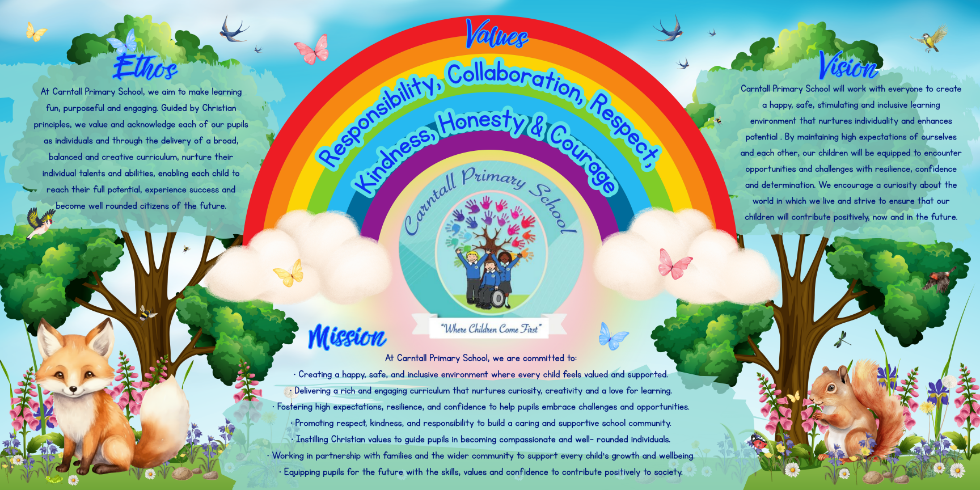 Carntall Primary School will work with everyone to create a happy, safe, stimulating and inclusive learning environment that nurtures individuality and enhances potential . By maintaining high expectations of ourselves and each other, our children will be equipped to encounter opportunities and challenges with resilience, confidence and determination. We encourage a curiosity about the world in which we live and strive to ensure that our children will contribute positively, now and in the future.